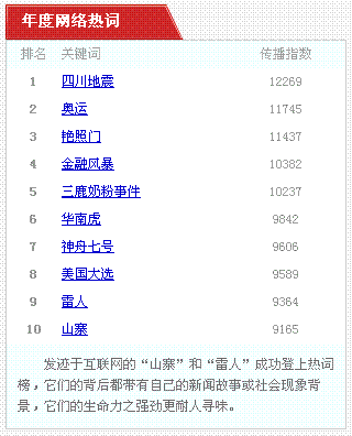年度網(wǎng)絡(luò)熱詞排行榜中,“四川地震”、“奧運”和“艷照門”成為2008年網(wǎng)友最關(guān)注的三大事件,分列該榜單前三甲。而發(fā)跡于互聯(lián)網(wǎng)的“山寨”和“雷”也成功入選年度十大網(wǎng)絡(luò)熱詞,與以往網(wǎng)絡(luò)流行詞所不同,它們的背后都帶有自己的新聞故事或社會現(xiàn)象背景,生命力之強勁更耐人尋味。