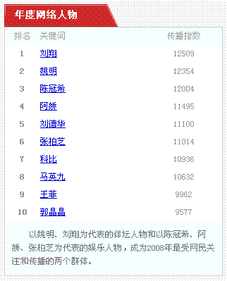 受到北京舉辦奧運會的影響和“艷照門”事件的炒作,以姚明、劉翔為代表的體壇人物和以陳冠希、阿嬌、張柏芝為代表的娛樂人物,成為最受關(guān)注和傳播的兩類公眾人物??票取⒇惪藵h姆和菲爾普斯為十份榜單中僅有的三名外籍人士,科比還同時入選年度網(wǎng)絡(luò)人物和年度體壇人物的十強。在年度企業(yè)家榜單中,以王石、黃光裕、牛根生等為代表的爭議性人物和以丁磊、馬云為代表的商業(yè)模式英雄,成為最受關(guān)注和傳播的兩類企業(yè)家。